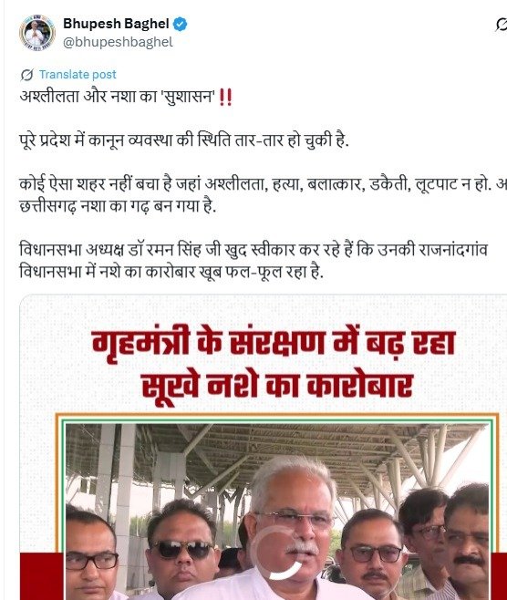 भूपेश बघेल ने अपने एक्स हैंडल पर लिखा कि अश्लीलता और नशा का ‘सुशासन। पूरे प्रदेश में कानून व्यवस्था की स्थिति तार-तार हो चुकी है। कोई ऐसा शहर नहीं बचा है जहां अश्लीलता, हत्या, बलात्कार, डकैती, लूटपाट न हो।