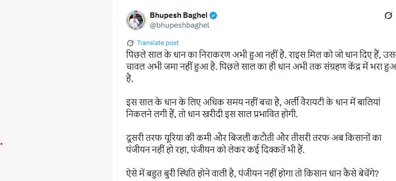 भूपेश बघेल ने कहा कि इस साल के धान के लिए अधिक समय नहीं बचा है, अर्ली वैरायटी के धान में बालियां निकलने लगी हैं, तो धान खरीदी इस साल प्रभावित होगी। दूसरी तरफ यूरिया की कमी और बिजली कटौती और तीसरी तरफ अब किसानों का पंजीयन नहीं हो रहा।