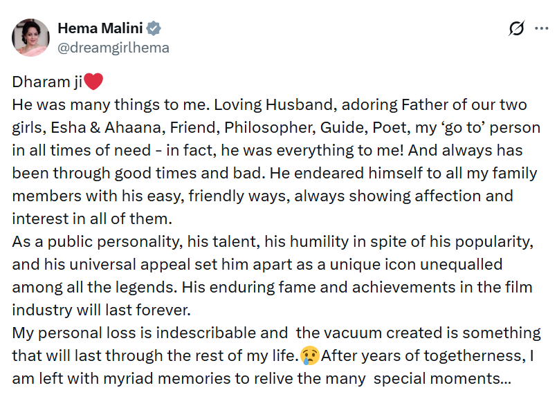 उनकी यूनिवर्सल अपील ने उन्हें सभी लेजेंड्स के बीच एक यूनिक आइकन के रूप में अलग बनाया। फिल्म इंडस्ट्री में उनकी हमेशा रहने वाली शोहरत और कामयाबियां हमेशा रहेंगी। मेरा पर्सनल नुकसान शब्दों में बयां नहीं किया जा सकता और जो खालीपन पैदा हुआ है, वह कुछ ऐसा है (Hema Malini emotional post) जो मेरी बाकी ज़िंदगी रहेगा।😢सालों तक साथ रहने के बाद, मेरे पास कई खास पलों को फिर से जीने के लिए बहुत सारी यादें बची हैं…